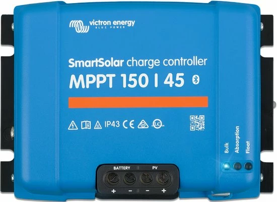 Victron SmartSolar MPPT 150/45 12/24/48V is een zonnelader voor 12V, 24V, 36V of 48V systemen (autoselect). Het maximaal nominaal PV-vermogen dat bij een 12V systeemspanning door de zonnelader wordt doorgegeven is 650W, bij een 24V systeemspanning is dat 1300W, bij een 36V systeemspanning is dat 1950W, en bij een 48V systeemspanning is dat 2600W. De maximale PV-nullast-spanning van deze zonnelader is 150V. De SmartSolar zonne-laadregelaars hebben een programmeerbaar acculaad-algoritme, en standaard Bluetooth Smart ingebouwd om de zonnelader te kunnen instellen en zonneopbrengst te kunnen monitoren.
