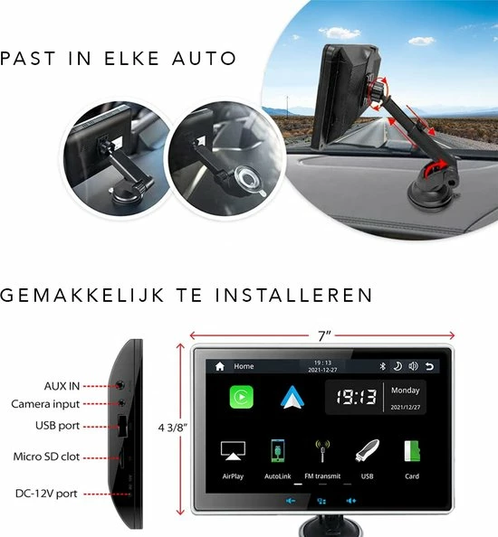 - Draagbaar universeel Carplay systeem. Speciaal ontworpen voor auto?s die geen Apple Carplay ondersteunen. Gemakkelijk te bevestigen aan het raam via de meegeleverde schermhouder met zuignap.