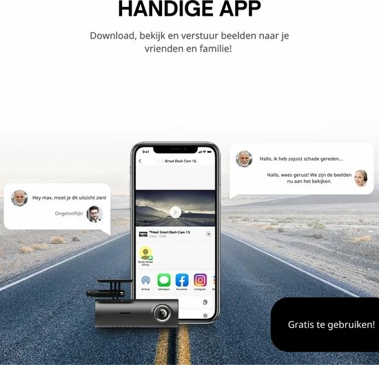Deze dashcam werkt heel simpel monteer de dashcam aan je voorruit en sluit de kabel aan. Pak de handleiding erbij voor het instellen van de dashcam zelf. Ook kun je alvast de applicatie op je favoriete apparaat installeren. De Dashcam begint automatisch te filmen als er beweging rondom de auto wordt geconstateerd. Ook kun je de dashcam zo instellen dat hij constant opneemt in videofragmenten van 3, 5 of 10 minuten.