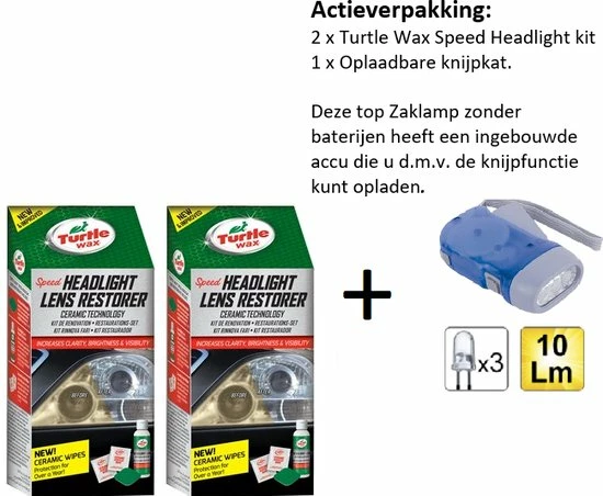 Turtle Wax introduceert nu een professioneel systeem en een precieze manier om de helderheid van koplampen en achterlichten te herstellen en/of te verbeteren bij door de zon beschadigde, gekraste, geoxideerde lenzen. Troebele, melkachtige en vergeelde lenzen kunnen het zicht ‘s nachts of tijdens slechte zichtomstandigheden verminderen. De nieuwste verbetering van de Turtle Wax Speed Headlight Lens Restorer Kit vermindert de inwerktijd of werkt 35% sneller met betere resultaten. De nieuwe kit bevat een sneller en beter reinigende Headlight Lens Repair & Renew Compound die vergeling en zandstrepen beter verwijdert en slechts 1 tweezijdige professionele Restoration Pad nodig heeft om hardnekkige plastic oxidatie te verwijderen. Een katoenen doek is nodig om de Headlight Lens Repair & Renew Compound aan te brengen en op te poetsen, maar deze is niet inbegrepen in de kit.